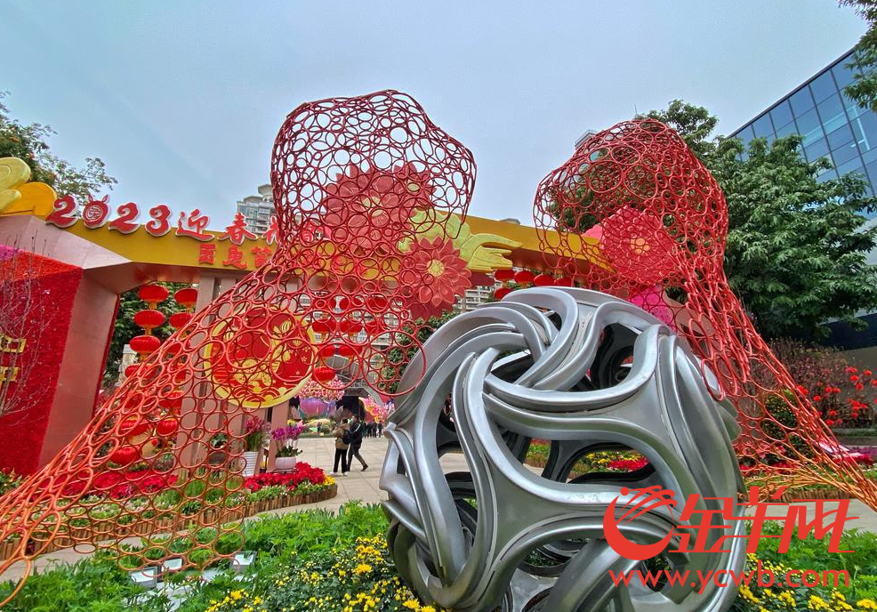 红色灯笼高高挂,鲜花灿烂迎宾来。走进广州文化公园正门,新春花会多座景组映入眼帘,走过“瑞狮迎宾”和“迎宾门”,左右两侧的景组充满着岭南元素,卯年玉兔、卖鸡公榄的伯伯、踢毽子的孩童,羊城美景等都能从景组中找到相应的元素,据悉,公园共布置了20座主题景组。