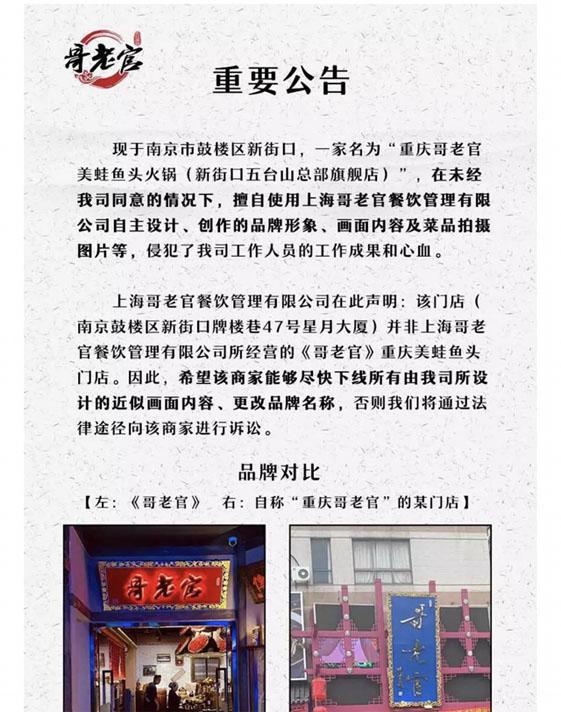 石鼓路、五台山哥老官门店,到底是真是假?上海哥老官餐饮管理有限公司有线 日,哥老官在其官方微信公众号发出郑重声明:现于南京市鼓楼区新街口,一家名为 重庆哥老官美蛙鱼头火锅(新街口五台山总部旗舰店),在未经我司同意的情况下,擅自使用上海哥老官餐饮管理有限公司自主设计、创作的品牌形象、画面内容及菜品拍摄图片等,侵犯了我司工作人员的工作成果和心血。