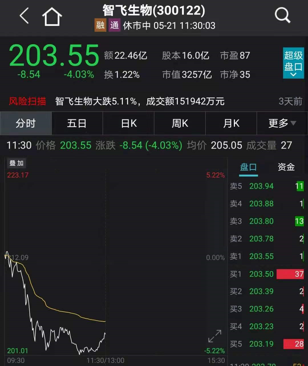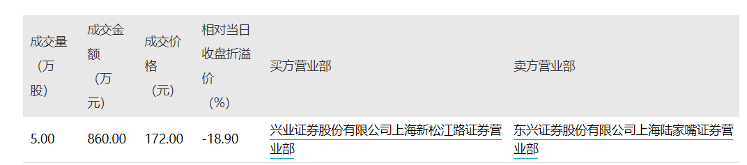 根据数据显示,智飞生物5月20日大宗交易平台出现一笔成交,成交量5。00万股,成交金额860。00万元,大宗交易成交价为172。00元,相对20日收盘价折价18。90%。
