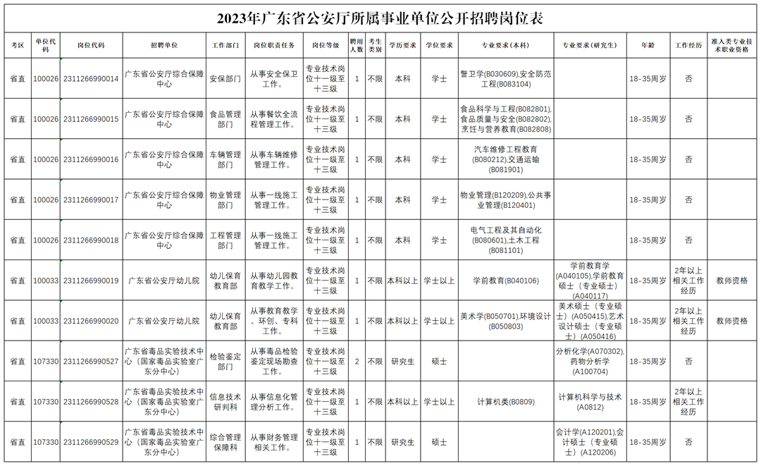 3月22日,广东省委组织部、广东省人力资源和社会保障厅联合发布公告,提供1万余个编制岗位,公开招聘高校毕业生,招聘将于2023年4月10日9!00至4月12日16!00接受报名,5月进行笔试广州抓龙筋会所。其中广东省公安厅所属事业单位本次公开招聘11人。(具体岗位要求详见下表)。