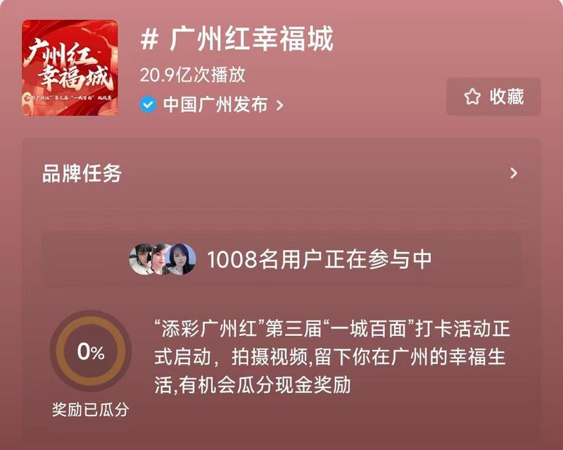 据悉,此次“一城百面”挑战赛将在抖音、今日头条、图虫三个客户端同时举办。其中,“一城百面”抖音全民任务挑战赛活动时间为7月3日至7月12日。活动期间,大家可进入抖音话题“#广州红幸福城”,点击话题页下方 “立即参与”按钮,便可拍摄上传在广州幸福生活美好瞬间的视频作品。优秀视频作品将获取官方流量支持,还有机会瓜分现金奖励。