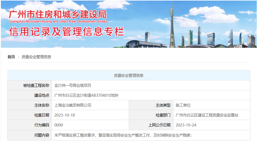 公示的详情显示,被检查工程为金沙洲一号商业楼项目,建设地点在广州市白云区金沙街道AB3704010地块,施工单位为上海宝冶集团有限公司,问题内容是未严格落实停工整改要求,督促落实现场安全生产整改工作广州抓龙筋,及时消除安全生产隐患。