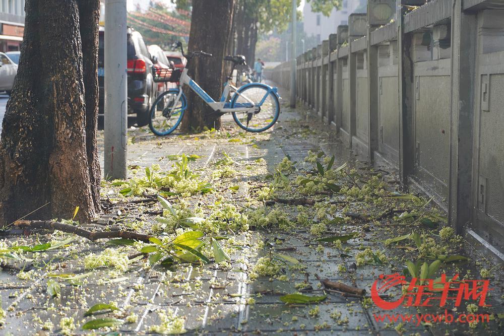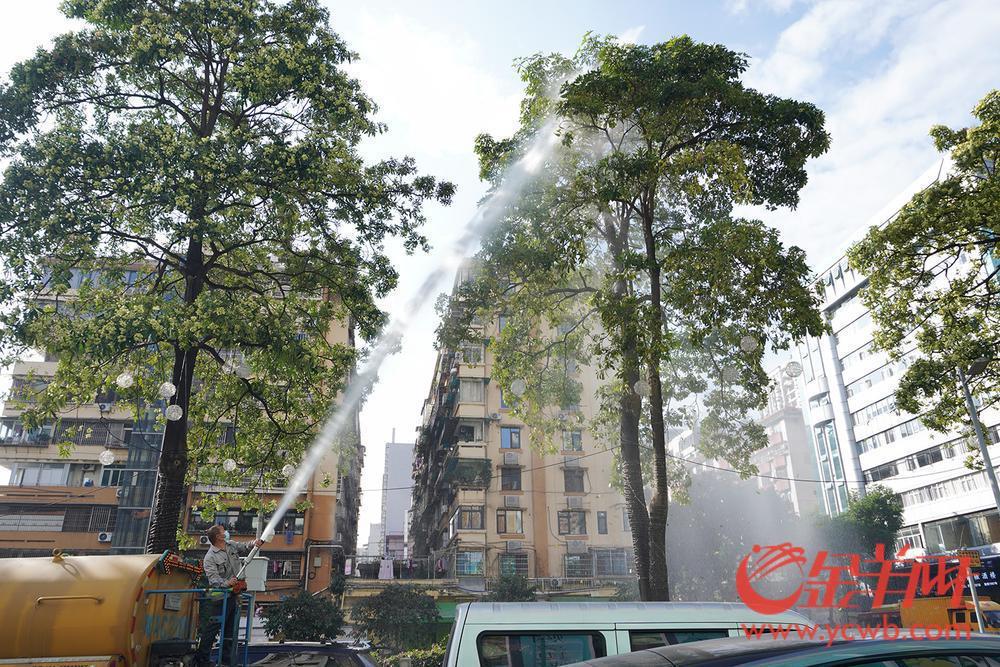 越秀区绿化养护第二工区养护班副班长王坤云表示:“寺右一马路约有30多棵糖胶树,为了不影响糖胶树的生长和外观,减少糖胶树花味对市民的影响,我们会使用高压水枪喷洒糖胶树花,除了能降低糖胶树的花味,还能缩短糖胶树的花期。”。