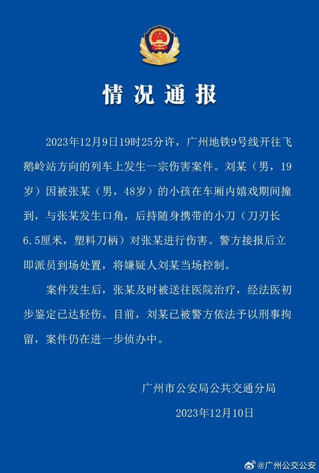 根据广州公交公安官方微博消息,事发当晚,刘某(男,19岁)因被张某(男,48岁)的小孩在车厢内嬉戏期间撞到,与张某发生口角,后持随身携带的小刀(刀刃长6。5厘米广州正宗抓龙筋,塑料刀柄)对张某进行伤害。警方接报后立即派员到场处置,将嫌疑人刘某当场控制。