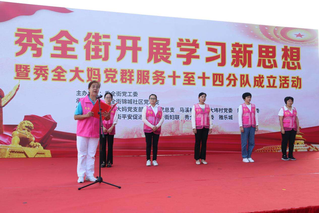 “我志愿加入‘秀全大妈’群防共治志愿队伍。我承诺:尽己所能,不计报酬,帮助他人,服务社会,践行志愿精神,传播先进文化,为营造共治共享的社会治理新格局贡献力量!”在秀全大妈党群服务队总队长张晓英的带领下,秀全大妈党群服务十至十四分队队员代表宣读入队誓词,声音铿锵有力,响彻现场。