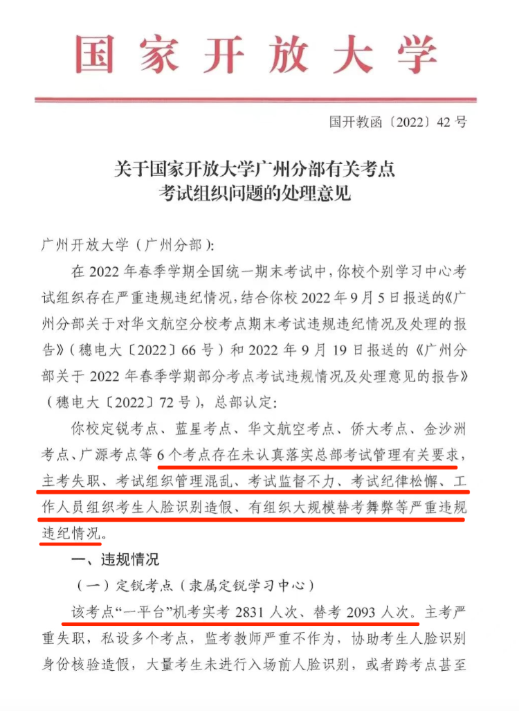 记者从国家开放大学《关于国家开放大学广州分部有关考点考试组织问题的处理意见》国开教函【2022】42号看到,2022年春季学期全国统一期末考试,广州开放大学(广州分部)报告辖区个别学习中心考试组织发生严重舞弊广州抓龙筋工作室。对此,国家开放大学总部认定“定锐考点、蓝星考点、华文航空考点、侨大考点、金沙洲考点、广源考点等6个考点存在未认真落实总部考试管理有关要求,主考失职、考试组织管理混乱、考试监督不力、考试纪律松懈、工作人员组织考生人脸识别造假、有组织大规模替考舞弊等严重违规违纪情况。”?