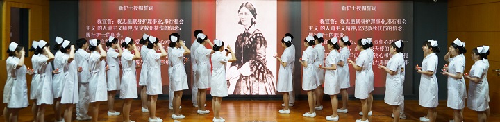 提灯女神用爱和温暖的灯光驱散伤者的阴云,燃起患者对生命炙热的渴望。接过神灯,肩负使命,烛光冉冉,薪火相传。32名新接受前辈为他们戴上圣洁的燕帽。随着一支支红烛在新老护理人手中传递,救死扶伤的承诺和护佑生命的誓言得以传承。