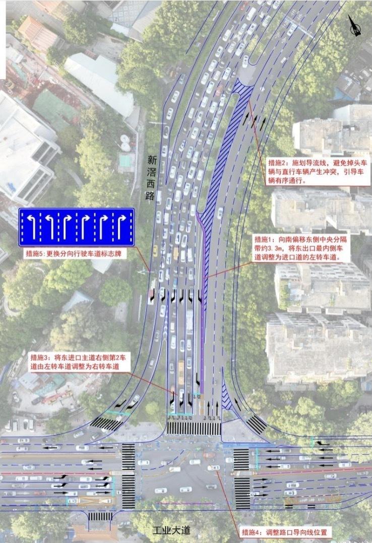 针对海珠区工业大道新滘西路通组织,部门将在该路口范围逐步实施新滘西路进出口车道功能调整,减少西往东一条机动车道,增加东往北一条右转车道,形成“2左转+4右转”车道布局等改造措施。