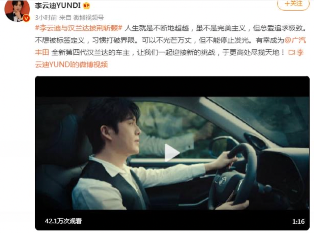 其中,今年1月25日,橱柜品牌、A股上市公司皮阿诺正式签约国际钢琴大师李云迪为品牌形象代言人。5月21日,长城汽车WEY摩卡以“摩力觉醒 焕然新生”为主题的上市发布会于北京举行,作为WEY摩卡第521号车主,李云迪现场演奏了钢琴曲。8月,广汽丰田宣布“钢琴王子”李云迪为旗下汽车品牌汉兰达代言人。