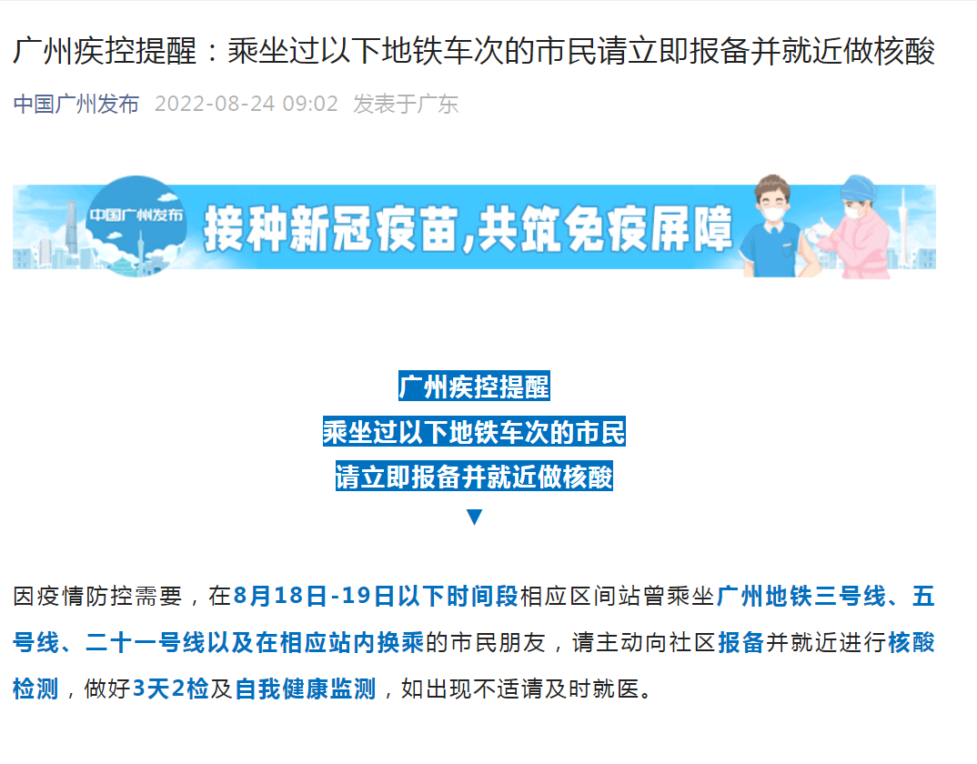 同时,据中国广州发布24日消息,广州疾控提醒乘坐过以下地铁车次的市民,请立即报备并就近做核酸。因疫情防控需要,在8月18日-19日以下时间段相应区间站曾乘坐广州地铁三号线、五号线、二十一号线以及在相应站内换乘的市民朋友,请主动向社区报备并就近进行核酸检测,做好3天2检及自我健康监测,如出现不适请及时就医。