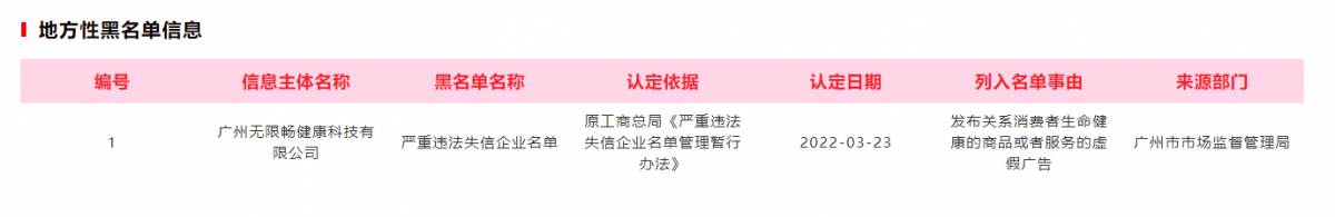 信用广州网站显示,广州无限畅健康科技有限公司因发布关系消费者生命健康的商品或者服务的虚假广告,被广州市市场监督管理局认定为严重违法失信企业。认定日期为2022年3月23日。