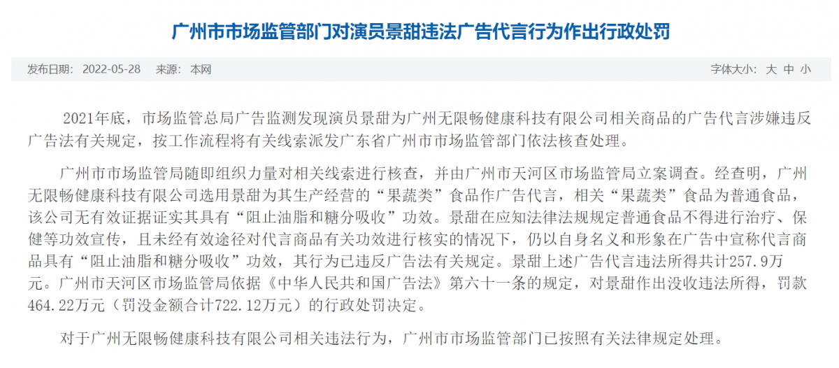 近日,广州市市场监督管理局发布广州市市场监管部门对演员景甜违法广告代言行为作出行政处罚的公告。2021年底,市场监管总局广告监测发现演员景甜为广州无限畅健康科技有限公司相关商品的广告代言涉嫌违反广告法有关规定,按工作流程将有关线索派发广东省广州市市场监管部门依法核查处理。