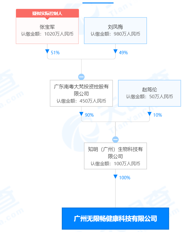 天眼查APP资料显示,广州无限畅健康科技有限公司为知明(广州)生物科技有限公司全资子公司。知明(广州)生物科技有限公司则由广东南粤大梵投资控股有限公司、赵笃伦分别持股90%、10%,赵笃伦也是知明(广州)生物科技有限公司的法定代表人。广东南粤大梵投资控股有限公司则由张宝军、刘凤梅分别持股51%、49%。